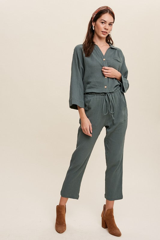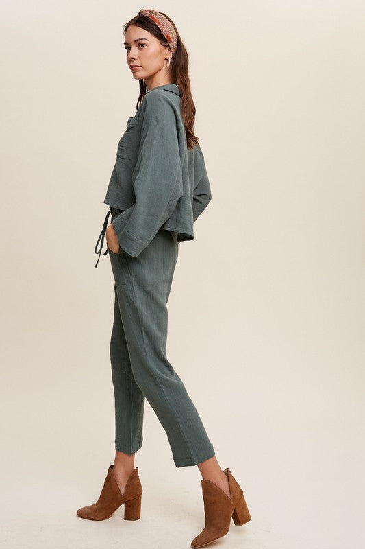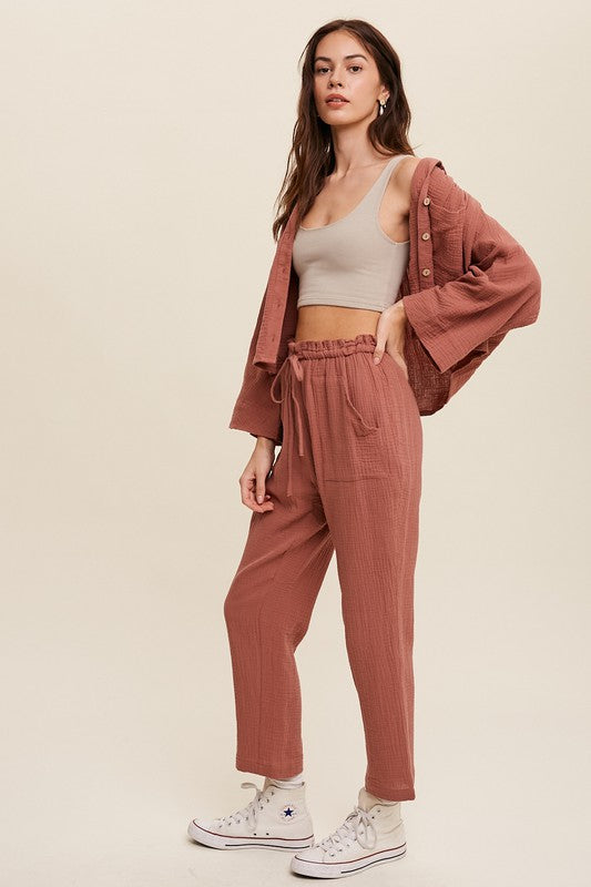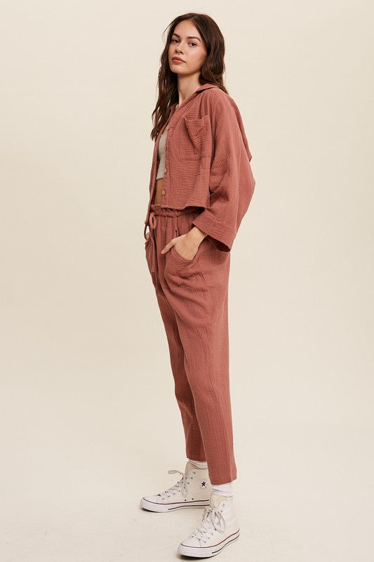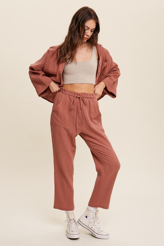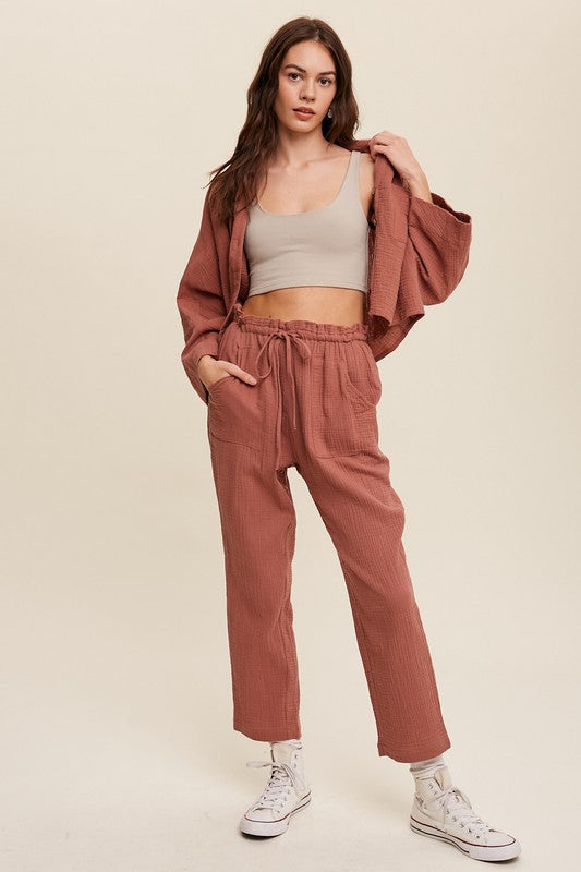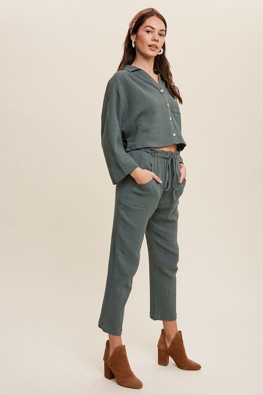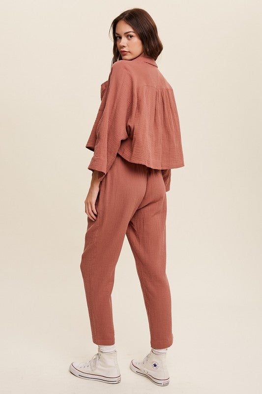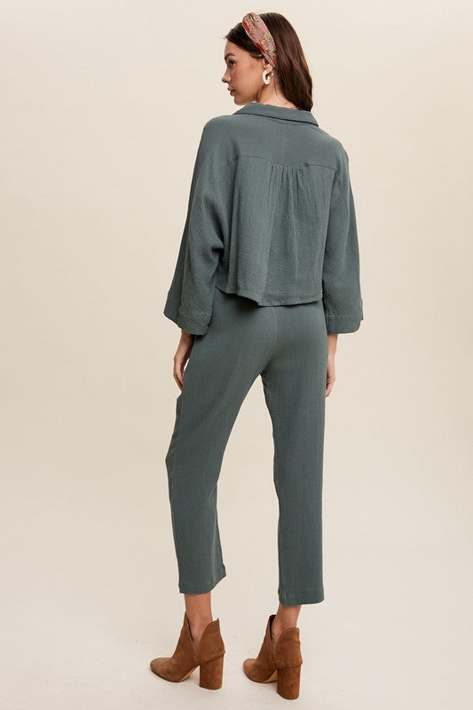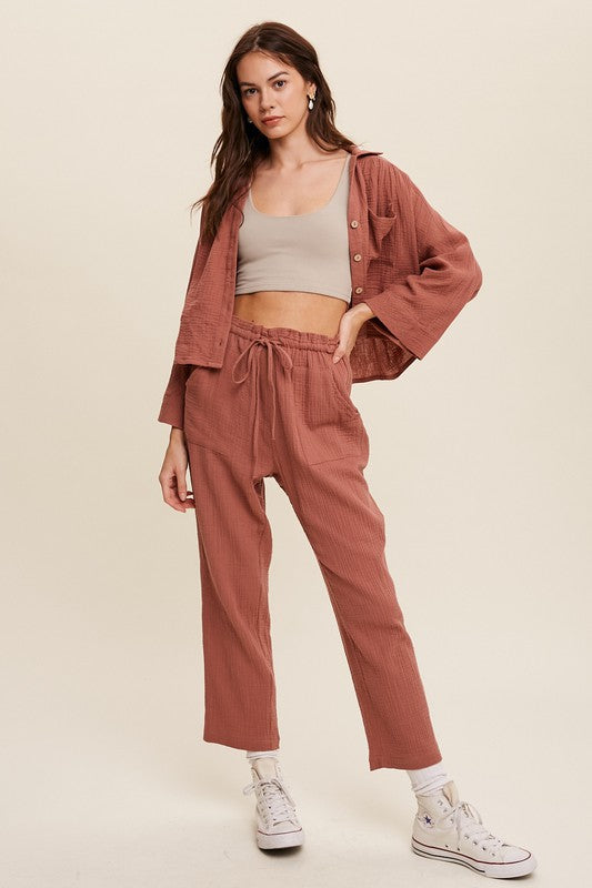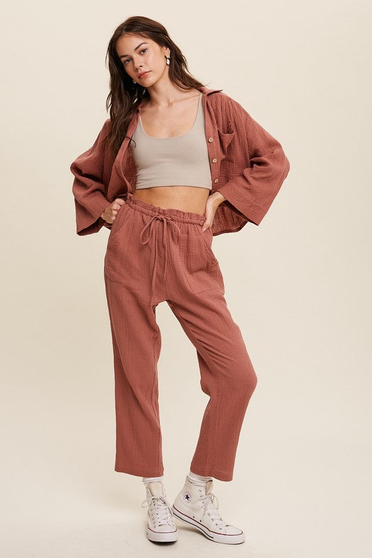 This set redefines versatility with its cohesive design. The long sleeve button-down top adds a touch of sophistication, while the long pants provide comfort and coverage. Our Long Sleeve Button Down and Long Pants Set effortlessly merges comfort and fashion. Embrace the ease of a matching set and showcase your unique fashion sensibilities with this must-have ensemble that embodies both confidence and style.